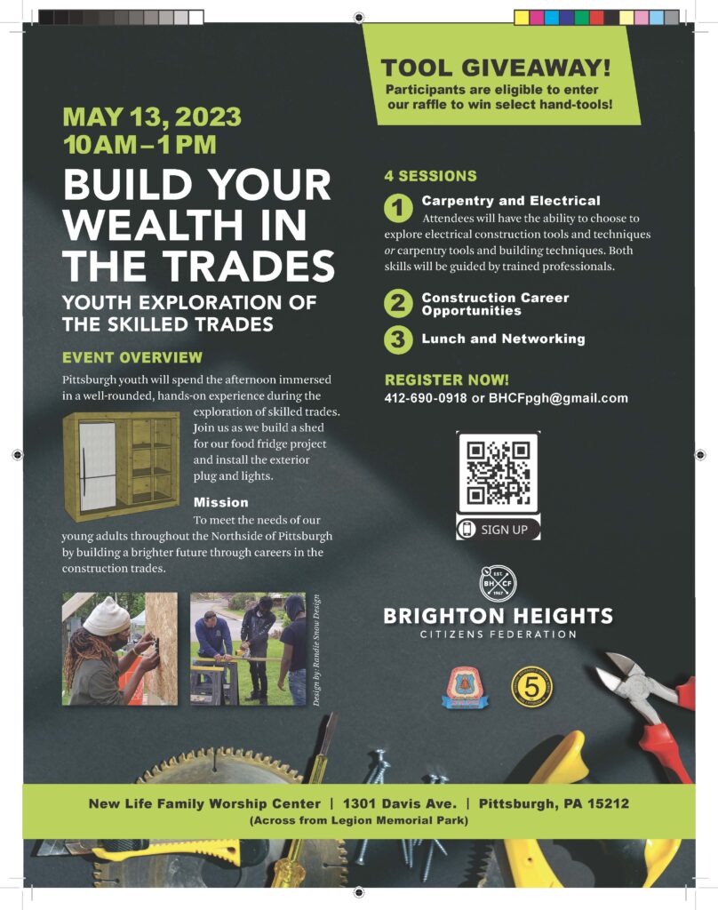 Students in grades six through 12 — and other young adults — are invited to Build Your Wealth in the Trades. This event will showcase the many skilled trades careers available right here in southwestern PA. RSVP by phone at (412) 690-0918 or email us at BHCFpgh@gmail.com.